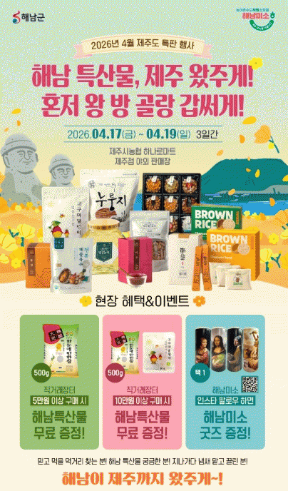 ÇØ³²±ºÀº ¹Ù´Ù °Ç³Ê Á¦ÁÖ ¼ÒºñÀÚ¸¦ ã¾Æ ¿À´Â 17ÀϺÎÅÍ 19ÀÏ, 3Àϰ£ Á¦ÁֽóóÇù Çϳª·Î¸¶Æ® Á¦ÁÖÁ¡ ¾ß¿ÜƯ¼³¸ÅÀå¿¡¼­ ³ó¼öƯ»ê¹° Á÷°Å·¡ÀåÅ͸¦ ¿î¿µÇÑ´Ù. À̹ø Çà»ç¿¡¼­´Â ÇØ³²°í±¸¸¶¸¦ ºñ·ÔÇØ Àâ°î·ù, Â÷·ù, °¡°ø½Äǰ µî 100¿©Á¾ÀÇ ´Ù¾çÇÑ ³ó¼öƯ»ê¹°À» ÇÕ¸®ÀûÀÎ °¡°ÝÀ¸·Î ¼±º¸ÀÏ ¿¹Á¤ÀÌ´Ù.