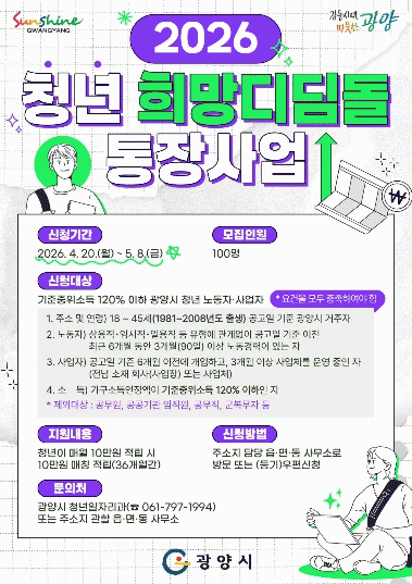 ¡®Ã»³â Èñ¸Áµðµõµ¹ ÅëÀå»ç¾÷¡¯Àº Àü¶ó³²µµ¿Í ±¤¾ç½Ã°¡ °øµ¿À¸·Î ÃßÁøÇÏ´Â µµºñ º¸Á¶»ç¾÷À¸·Î, û³âÀÌ ¸Å¿ù 10¸¸ ¿ø¾¿ 36°³¿ù µ¿¾È Àû¸³Çϸé ÁöÀÚü°¡ °°Àº ±Ý¾×À» Áö¿øÇØ ¸¸±â ½Ã ÃÖ´ë 720¸¸ ¿ø°ú ÀÌÀÚ¸¦ ¹ÞÀ» ¼ö ÀÖ´Ù.