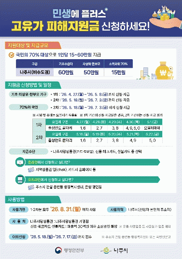 1Â÷ Áö±Þ ±â°£ ³»¿¡ Áö¿ø±ÝÀ» ½ÅûÇÏÁö ¸øÇÑ »ç¶÷°ú ±× ¿Ü 70%¿¡ ÇØ´çÇÏ´Â ½Ã¹ÎµéÀº 2Â÷ ½Åû ±â°£Àº 5¿ù 18ÀϺÎÅÍ 7¿ù 3ÀÏ »çÀÌ¿¡ ½Åû°ú Áö¿ø±Ý ¼ö·ÉÀÌ °¡´ÉÇÏ´Ù.