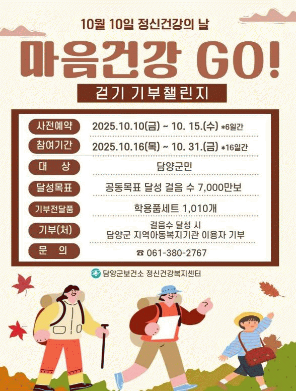 ¡®¸¶À½°Ç° °í(GO)! °È±â ±âºÎ縰Áö¡¯´Â ±º¹ÎÀÌ Àϻ󿡼 °È±â¸¦ ½ÇõÇϸç Á¤½Å°Ç° ÁõÁø°ú ³ª´®À» µ¿½Ã¿¡ ½ÇÇöÇÏ´Â Çà»ç´Ù. 10¿ù 16ÀϺÎÅÍ 31ÀϱîÁö 16Àϰ£ 7õ¸¸ º¸ÀÇ °øµ¿°ÉÀ½À» ¸ñÇ¥·Î ÁøÇàÇÑ´Ù.