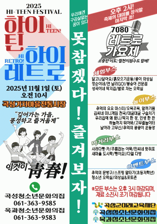 ÇÑÆí, 2025 °î¼ºÃ»¼Ò³â ÇÏÀÌÆ¾ Æä½ºÆ¼¹ú ¡®HI-TEEN, HI-RETRO¡¯´Â û¼Ò³âµéÀÇ ¹®ÈÀû °¨¼º°ú âÀǼºÀ» Ç¥ÇöÇÒ ¼ö ÀÖ´Â ÀåÀ¸·Î, RETRO °¡¿äÁ¦, üÇ衤³îÀÌ¡¤¸Ô°Å¸®¡¤À̺¥Æ® ºÎ½º µî ÃÑ 28°³ÀÇ ºÎ½º°¡ ¿î¿µµÉ ¿¹Á¤ÀÌ´Ù. Çà»ç´Â ¿À´Â 11¿ù 1ÀÏ °î¼º±âÂ÷¸¶À»ÀüÅë½ÃÀå ÀÏ¿ø¿¡¼ °³ÃÖµÉ ¿¹Á¤ÀÌ´Ù.