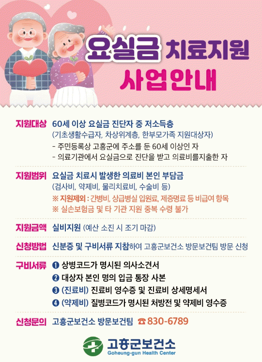 Áö¿ø ´ë»óÀº °íÈﱺ¿¡ ÁÖ¼Ò¸¦ µÐ 60¼¼ ÀÌ»ó ¾î¸£½Å Áß ÀÇ·á±â°ü¿¡¼ ¿ä½Ç±Ý Áø´ÜÀ» ¹Þ°í Ä¡·áºñ¸¦ ÁöÃâÇÑ ¡ã±âÃÊ»ýȰ¼ö±ÞÀÚ ¡ãÂ÷»óÀ§°èÃþ ¡ãÇѺθð°¡Á· µî Àú¼ÒµæÃþÀÌ´Ù.