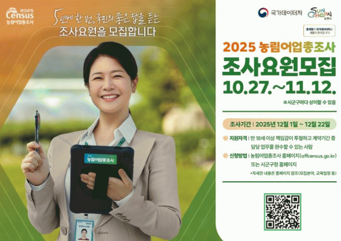 ¸ðÁý °ø°í´Â 2025 ³ó¸²¾î¾÷ÃÑÁ¶»ç ȨÆäÀÌÁö¿Í ¼øÃµ½Ã ȨÆäÀÌÁö¸¦ ÅëÇØ È®ÀÎÇÒ ¼ö ÀÖÀ¸¸ç, 11¿ù 12ÀϱîÁö ³ó¸²¾î¾÷ÃÑÁ¶»ç ȨÆäÀÌÁö ¶Ç´Â ¼øÃµ½Ã µðÁöÅÐÁ¤Ã¥°ú·Î ¹æ¹® Á¢¼öÇÏ¸é µÈ´Ù.