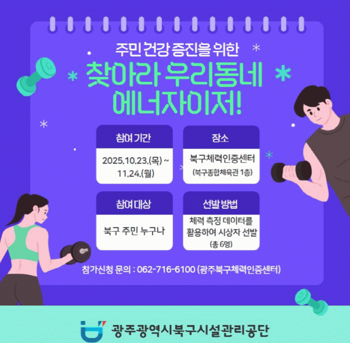 ±¤ÁÖ±¤¿ª½ÃºÏ±¸½Ã¼³°ü¸®°ø´ÜÀº Áö¿ª ÁֹεéÀÇ Ã¼·Â ÁõÁø°ú °Ç°­ÇÑ »ýȰ ½À°ü Çü¼ºÀ» À§ÇØ ¡®Ã£¾Æ¶ó ¿ì¸®µ¿³× ¿¡³ÊÀÚÀÌÀú!¡¯ 2±â ¼±¹ß´ëȸ¸¦ °³ÃÖÇÑ´Ù°í ¹àÇû´Ù.