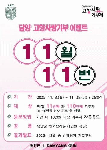 º» À̺¥Æ®´Â ÇØ´ç ±â°£ ³» ´ã¾ç±º¿¡ 10¸¸ ¿ø ÀÌ»ó ±âºÎ¸¦ ÇÏ´Â °æ¿ì ÀÚµ¿ ÀÀ¸ðµÇ¸ç, ¸ÅÀÏ 11¹øÂ°¿Í 110¹øÂ° ±âºÎÀÚ¿¡°Ô 1¸¸ ¿ø »ó´çÀÇ ´ã¾ç±º Àα⠴ä·ÊǰÀ» ÁõÁ¤ÇÑ´Ù.