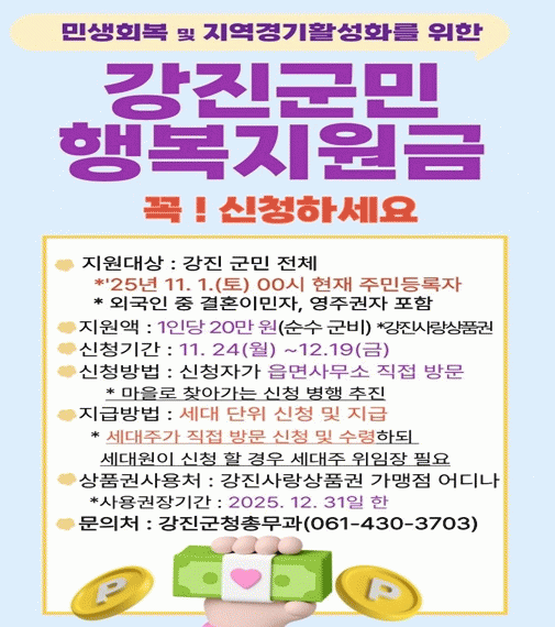 Áö¿ø´ë»óÀº 10¿ù 31ÀÏ ±âÁØÀ¸·Î °­Áø±º¿¡ ÁÖ¼Ò¸¦ µÐ ±º¹ÎÀÌ¸é ´©±¸³ª ½Åû°¡´ÉÇÏ´Ù. ¶ÇÇÑ ¿Ü±¹ÀÎ Áß °áÈ¥À̹ÎÀÚ¿Í ¿µÁÖ±ÇÀ» °¡Áø »ç¶÷µµ Æ÷ÇԵȴÙ.