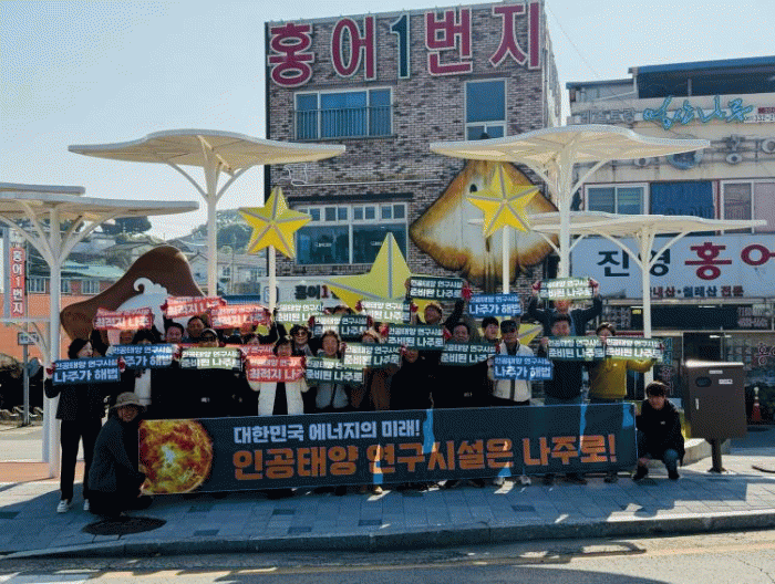 Âü¼®ÀÚµéÀº ¾²·¹±â ¹«´ÜÅõ±â ±ÙÀý, ºÒ¹ý ÁÖÁ¤Â÷ ÀÚÁ¦ µî »ýȰ ¼Ó Áú¼ ÁöŰ±â ½ÇõÀ» ´çºÎÇÏ¸ç ¡°ÀΰøÅÂ¾ç ¿¬±¸½Ã¼³, ÁغñµÈ ³ªÁÖ·Î!¡±, ¡°´ëÇѹα¹ ¿¡³ÊÁö ¹Ì·¡, ³ªÁÖ°¡ ÇØ¹ýÀÌ´Ù!¡± µîÀÇ ±¸È£¸¦ ¿ÜÄ¡¸ç ÀΰøÅÂ¾ç ¿¬±¸½Ã¼³ÀÇ ³ªÁÖ À¯Ä¡¸¦ ¿°¿øÇÏ´Â ÆÛÆ÷¸Õ½º¸¦ ÁøÇàÇß´Ù.