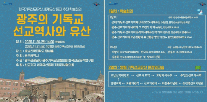 ±¤ÁÖ±¤¿ª½Ã´Â 20~21ÀÏ È£³²½ÅÇдëÇб³ ÀÏ¿ø¿¡¼­ ¡®Çѱ¹±âµ¶¼±±³À¯»ê ¼¼°èÀ¯»ê µîÀç ÃßÁøÀ» À§ÇÑ ÇмúȸÀÇ¿Í ¿öÅ©¼ó¡¯À» ¿­¾î Çѱ¹ ±Ù´ë ±âµ¶±³ ¼±±³ÀÇ ¿ª»çÀû °¡Ä¡¸¦ Á¶¸íÇÑ´Ù.
