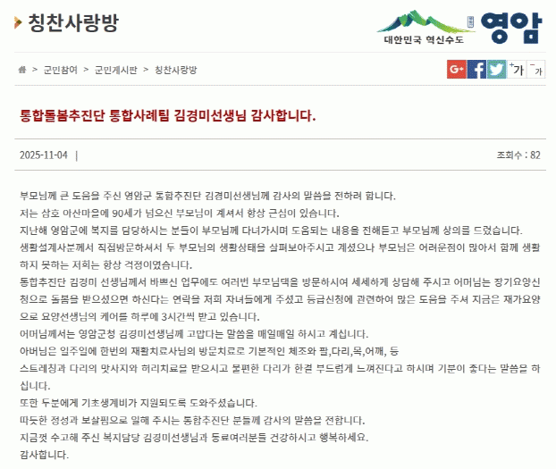 ¾Æ¿ï·¯ 1ÁÖÀÏ¿¡ 2ȸ¾¿ ÅëÇÕ»ç·Ê°ü¸®»çÀÇ Á¤±â °¡Á¤ ¹æ¹®À¸·Î µÎ ¾î¸£½Å¿¡°Ô Áö¿ª º¹ÁöÀÚ¿øÀ» ¿¬°èÇØ ÁÖ°í ÀÖ´Ù.