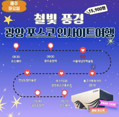 Åõ¾î´Â À¯½ºÄù¾î(08:30) Ãâ¹ß ¡æ ±¤ÁÖ¼ÛÁ¤¿ª(09:00) ¡æ ¼¿ï´ë ³²ºÎÇмú¸² ¡æ ±¤¾çºÒ°í±âƯȰŸ®(Áß½Ä) ¡æ Æ÷½ºÄÚÈ«º¸°ü Park1538 ¡æ Àü³²µµ¸³¹Ì¼ú°ü ¡æ ¼ÛÁ¤¿ª(18:00) ¡æ À¯½ºÄù¾î(18:25) ¼øÀ¸·Î ÁøÇàµÈ´Ù.