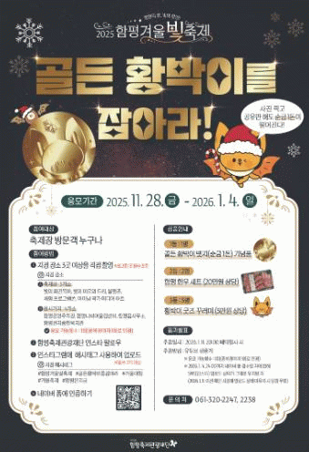 À̹ø À̺¥Æ®´Â °Ü¿ïºûÃàÁ¦ÀåÀ» ¹æ¹®ÇÑ ±¹¹Î ´©±¸³ª Âü¿©ÇÒ ¼ö ÀÖÀ¸¸ç, ÇÔÆòÃàÁ¦°ü±¤Àç´ÜÀº ³»³â 1¿ù 11ÀÏ °Ü¿ïºûÃàÁ¦ Æó¸·½Ä¿¡¼ °ø°³ Ãß÷À» ÅëÇØ ¡ã1µî ¼ø±Ý ÇÑ µ· ¡®°ñµç Ȳ¹ÚÀÌ ¹îÁö¡¯(1¸í) ¡ã2µî ÇÔÆò ÇÑ¿ì ¼±¹°¼¼Æ®(2¸í) ¡ã3µî Ȳ¹ÚÀÌ ±ÂÁî ²Ù·¯¹Ì(5¸í)¸¦ Á¦°øÇÑ´Ù.