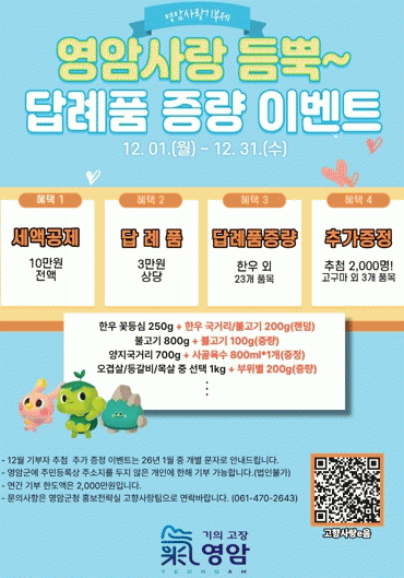 ÀÌ¿µÁÖ ¿µ¾Ï±º È«º¸Àü·«½ÇÀåÀº ¡°¿µ¾Ï±º °íÇâ»ç¶û±âºÎ¿¡ º¸³» ÁØ ¼º¿ø¿¡ º¸´äÇϱâ À§ÇØ 11¿ù¿¡ À̾î 12¿ù¿¡µµ ´õ¿í dz¼ºÇÑ ÇýÅÃÀ» ¸¶·ÃÇß´Ù. ¿µ¾Ï±º ³ó¡¤Æ¯»ê¹°ÀÇ ¿ì¼ö¼ºÀ» ³Î¸® ¾Ë¸®°í ±âºÎÀÚ ¸¸Á·µµ¸¦ ³ôÀÏ ¼ö ÀÖµµ·Ï ´Ù¾çÇÑ ÇÁ·Î±×·¥À» Áö¼Ó ÃßÁøÇϰڴ١±°í ¸»Çß´Ù.