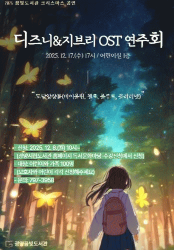 ±¤¾ç²Þºûµµ¼­°üÀÌ ¿À´Â 12¿ù 17ÀÏ ¿ÀÈÄ 5½Ã ¾î¸°À̽ǿ¡¼­ ¾î¸°ÀÌ¿Í °¡Á· 100¸íÀ» ´ë»óÀ¸·Î ¡®µðÁî´Ï&Áöºê¸® OST ¿¬ÁÖȸ¡¯¸¦ °³ÃÖÇÑ´Ù.