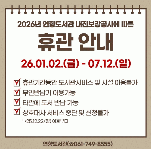 °ø»ç°¡ ÁøÇàµÇ´Â µ¿¾È, ¾ÈÀü»ç°í ¿¹¹æ µîÀ» À§ÇØ ¿¬Çâµµ¼­°üÀº Àӽà ÈÞ°üÇÑ´Ù. ÈÞ°ü¿¡ µû¸¥ ½Ã¹ÎµéÀÇ ÀÌ¿ë ºÒÆíÀ» ÁÙÀ̱â À§ÇØ ¿¬Çâµµ¼­°ü ´ëÇ¥ ¹®È­ÇÁ·Î±×·¥ÀÎ ¡®½Ã¹ÎÀι®ÇС¯°ú ¡®Ã»¼Ò³â Àι®ÇÐÇб³¡¯´Â °ü³» ½Ã¸³µµ¼­°üÀ¸·Î Àå¼Ò¸¦ ¿Å°Ü °ø¹é¾øÀÌ ¿î¿µÇϰí ÀüÀÚÃ¥ ¹× ¿Àµð¿ÀºÏ µî ºñ´ë¸é ¿Â¶óÀÎ ÄÜÅÙÃ÷ ÀÌ¿ë ¾È³»¸¦ ÅëÇØ ½Ã¹Î ¼ö¿ä¿¡ ´ëÀÀÇÒ ¿¹Á¤ÀÌ´Ù.