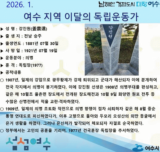 ÇÑÆí ½Ã´Â µ¶¸³¿îµ¿°¡ÀÇ ¿ª»çÀû °¡Ä¡¸¦ ÀçÁ¶¸íÇÏ°í µ¶¸³Á¤½Å È®»êÀ» À§ÇØ 2022³â 8¿ùºÎÅÍ ¿©¼öÁö¿ªµ¶¸³¿îµ¿°¡À¯Á·È¸¿Í °øµ¿À¸·Î Áö¿ª Ãâ½Å µ¶¸³¿îµ¿°¡¸¦ ¼±Á¤¡¤È«º¸Çϰí ÀÖÀ¸¸ç, ÇöÀç±îÁö ¿©¼öÁö¿ª µ¶¸³¿îµ¿°¡ ÃÑ 85¸íÀ» ¹ß±¼Çß´Ù.