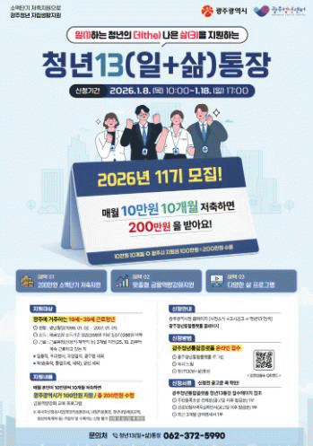 ¡®Ã»³â13ÅëÀ塯Àº 19~39¼¼ ±Ù·Îû³âÀÌ ¸Å¿ù 10¸¸¿ø¾¿ 10°³¿ù°£ 100¸¸¿øÀ» ÀúÃàÇϸé, ±¤Áֽð¡ 100¸¸¿øÀ» Áö¿øÇØ ÃÑ 200¸¸¿øÀÇ ¸¸±â±Ý°ú ÀÌÀÚ¸¦ ¸¶·ÃÇÒ ¼ö ÀÖ°Ô ÇÏ´Â ±¤Áֽà ´ëÇ¥ û³â ±ÝÀ¶ÀÚ»ê Çü¼º Áö¿ø »ç¾÷ÀÌ´Ù.