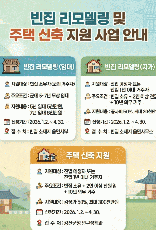 À̹ø ºóÁý ¸®¸ðµ¨¸µ Áö¿ø»ç¾÷Àº ¿À´Â 12ÀϺÎÅÍ 4¿ù 30ÀϱîÁö Á¢¼ö °¡´ÉÇϸç, ½ÅûÀÚ´Â ºóÁý ¼ÒÀç À¾¡¤¸é»ç¹«¼Ò¸¦ ¹æ¹®Çϰųª ¿ìÆíÀ¸·Î ½ÅûÇÒ ¼ö ÀÖ´Ù.