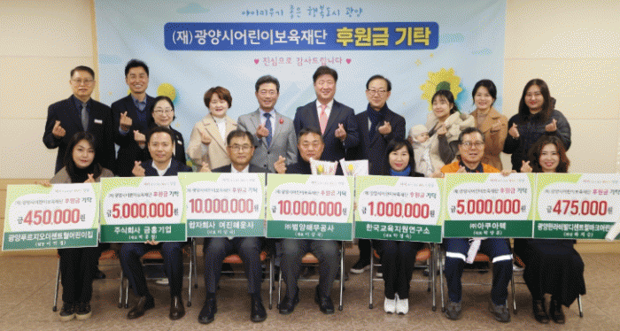 ±âŹ Âü¿©ÀÚ´Â ¡ã(ÁÖ)¹ü¾çÇØ¹«°ø»ç(´ëÇ¥ ÀÌ»ó±¹) 1,000¸¸ ¿ø ¡ãÇÕÀÚȸ»ç ¿©ÁøÇØ¿î»ç(´ëÇ¥ ÀÌ»ó±¹) 1,000¸¸ ¿ø ¡ãÁÖ½Äȸ»ç ±ÝÈ«±â¾÷(´ëÇ¥ ¹Úȫö) 500¸¸ ¿ø ¡ã(ÁÖ)¾ÆÄí¾ÆÅØ(´ëÇ¥ ¹Ú¾çÈÆ) 500¸¸ ¿ø ¡ãÇѱ¹±³À°Áö¿ø¿¬±¸¼Ò(´ëÇ¥ ¹ÚÁ¤¼÷) 100¸¸ ¿ø ¡ãÇØ¸¼Àº¾î¸°ÀÌÁý(¿øÀå ¹ÚÁ¤³²) 60¸¸ ¿ø ¡ã±¤¾çÇѶóºñ¹ßµð¼¾Æ®·²¸¶Å© ¾î¸°ÀÌÁý(¿øÀå ÇÏÁö½Â) 47¸¸ 5õ ¿ø ¡ã±¤¾çǪ¸£Áö¿À´õ¼¾Æ®·² ¾î¸°ÀÌÁý(¿øÀå À̹ΰæ) 45¸¸ ¿ø µîÀÌ´Ù.
