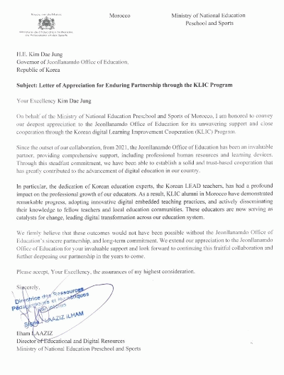 À̹ø °¨»ç ¼ÇÑÀº Àü¶ó³²µµ±³À°Ã»ÀÌ 2021³âºÎÅÍ ±³À° Á¤º¸È Áö¿ø »ç¾÷ (KLIC?Korean Digital-Learning Improvement Cooperation)À» ÅëÇØ ¸ð·ÎÄÚ ±³À°ºÎ¿Í µðÁöÅÐ ±³À° ºÐ¾ß¿¡¼ Áö¼ÓÀûÀÎ Çù·ÂÀ» À̾î¿Â µ¥ ´ëÇÑ Æò°¡¸¦ ´ã°í ÀÖ´Ù.