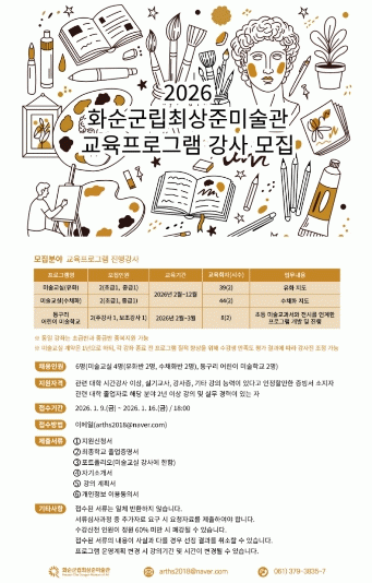 À̹ø °»ç ¸ðÁýÀº ¼ºÀÎ ´ë»ó ¹Ì¼ú ±³À° ÇÁ·Î±×·¥ÀÎ ¡®¹Ì¼ú±³½Ç¡¯°ú ¾î¸°ÀÌ ´ë»ó ÇÁ·Î±×·¥ÀÎ ¡®µ¿±¸¸® ¾î¸°ÀÌ ¹Ì¼úÇб³¡¯ ¿î¿µÀ» À§ÇÑ °ÍÀ¸·Î, ¹Ì¼úÀ» ÅëÇØ Áö¿ª Áֹΰú ¾î¸°ÀÌÀÇ Ã¢ÀǼº°ú ¿¹¼úÀû °¨¼ö¼ºÀ» Ű¿öÁÙ ¿ª·® ÀÖ´Â °»ç¸¦ ¼±¹ßÇÒ °èȹÀÌ´Ù.