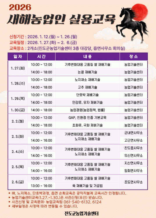 ±³À° ÀÏÁ¤Àº Áøµµ±º³ó¾÷±â¼ú¼¾ÅÍ ´©¸®Áý¿¡¼ È®ÀÎÇÒ ¼ö ÀÖ°í, 26ÀϱîÁö ÀüÈ µîÀ¸·Î ½ÅûÇÒ ¼ö ÀÖÀ¸¸ç, ÀÚ¼¼ÇÑ ³»¿ëÀº Áøµµ±º ³óÃÌȰ·Â°ú ³ó¾÷±³À°ÆÀ¿¡ ¹®ÀÇÇÏ¸é ¾È³»¹ÞÀ» ¼ö ÀÖ´Ù.
