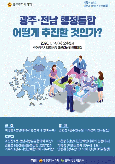 ±¤ÁÖ±¤¿ª½ÃÀÇȸ ÇàÁ¤ÀÚÄ¡À§¿øÀå ¾ÈÆòȯ ÀÇ¿øÀº 14ÀÏ ±¤ÁÖ±¤¿ª½ÃÀÇȸ¿¡¼­ '±¤ÁÖ¡¤Àü³² ÇàÁ¤ÅëÇÕ, ¾î¶»°Ô ÃßÁøÇÒ °ÍÀΰ¡?'¸¦ ÁÖÁ¦·Î Á¤Ã¥Åä·Ðȸ¸¦ °³ÃÖÇß´Ù.