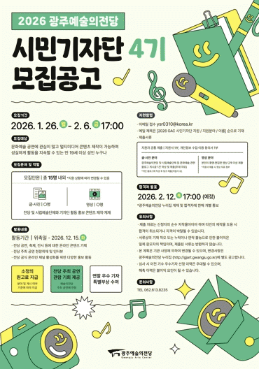 ¼±¹ßµÈ ½Ã¹Î±âÀÚ´ÜÀº ¿À´Â 3¿ùºÎÅÍ 12¿ù ¸»±îÁö ¾à 10°³¿ù°£ Ȱµ¿Çϸç, ±¤ÁÖ¿¹¼úÀÇÀü´çÀÇ °ø¿¬°ú ¹®È¿¹¼ú ÇöÀåÀ» ÃëÀçÇØ ±â»ç¿Í ÄÜÅÙÃ÷¸¦ Á¦ÀÛÇÏ°Ô µÈ´Ù. Àü´çÀº Ȱµ¿ ±âÀÚ´Ü¿¡°Ô ¼ÒÁ¤ÀÇ ¿ø°í·á, °ø¿¬ °ü¶÷ ±âȸ, ¿ì¼ö ±âÀÚ ½Ã»ó µî ´Ù¾çÇÑ ÇýÅÃÀ» Á¦°øÇÒ ¿¹Á¤ÀÌ´Ù.