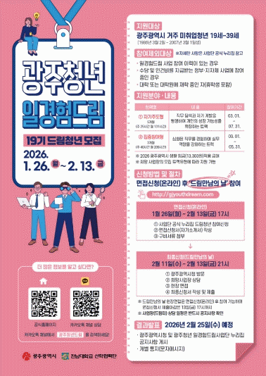 Âü¿©¸¦ Èñ¸ÁÇϴ û³âÀº 2¿ù13ÀÏ ¿ÀÈÄ 5½Ã±îÁö ±¤ÁÖû³â ÀϰæÇèµå¸² ´©¸®Áý¿¡ 1Â÷ ¸éÁ¢ ½Åû¼¸¦ Á¦ÃâÇÏ¸é µÈ´Ù. ½Åû ÈÄ¿¡´Â 2¿ù11ÀϺÎÅÍ 13ÀϱîÁö ½Ãû ½Ã¹ÎȦ¿¡¼ ¿¸®´Â ¡®µå¸²¸¸³²ÀÇ ³¯¡¯¿¡ ÇÏ·ç ÀÌ»ó Âü¿©ÇØ µå¸²ÅÍ »ó´ã°ú ¸éÁ¢À» ÁøÇàÇÑ µÚ 13ÀÏ ¿ÀÈÄ 9½Ã±îÁö 2Â÷ ÃÖÁ¾ ½Åû¼¸¦ Á¦ÃâÇÏ¸é µÈ´Ù. ¡®µå¸²¸¸³²ÀÇ ³¯¡¯ Çà»ç ÇöÀå¿¡¼µµ ½Åû°ú Âü¿©°¡ °¡´ÉÇÏ´Ù.