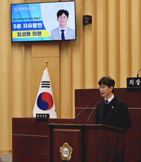 ±¤ÁÖ ¼­±¸ÀÇȸ ÀÓ¼ºÈ­ ÀÇ¿øÀÌ(Çö ¿î¿µÀ§¿øÀå) 23ÀÏ Á¦337ȸ ÀÓ½Ãȸ Á¦2Â÷ º»È¸ÀÇ¿¡¼­ ¡°ÇàÁ¤ ÅëÇÕÀÇ ÆÄ°í ¼Ó ¼­±¸ÀÇ °æÀï·ÂÀº ¡®°íÀ¯ÇÑ Á¤Ã¼¼º¡¯ È®¸³¿¡ ÀÖ´Ù¡±¶ó¸ç '¼­±¸(à¤Ï¡)¶ó´Â ÇàÁ¤ ÆíÀÇÁÖÀÇÀûÀÎ À̸§Ç¥¸¦ ¶¼°í, ¿ì¸®¸¸ÀÇ 'ÁøÂ¥ À̸§'À» ã±â Á¦¾ð' À̶ó´Â Á¦¸ñÀÇ ¡®5ºÐ ÀÚÀ¯¹ß¾ð¡¯À» Çß´Ù.