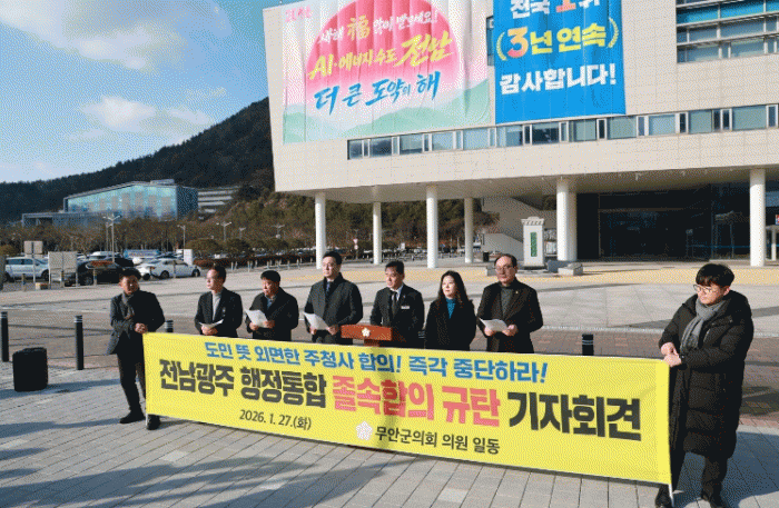±ºÀÇȸ´Â ¡°ÀÌ¹Ì 1¿ù 25ÀÏ °£´ãȸ¿¡¼ ÁÖû»ç¸¦ ¹«¾È Àü¶ó³²µµÃ»À¸·Î ÇÑ´Ù´Â ÀáÁ¤ ÇÕÀǰ¡ ÀÖ¾úÀ½¿¡µµ À̸¦ µÚÁý°í ¡®ÁÖû»ç´Â Ưº°½ÃÀå ±ÇÇÑ¡¯À̶ó°í µ¹·Á ¸»ÇÑ °ÍÀº ÅëÇÕÀÇ ´ë¿øÄ¢ÀÎ »ó»ý°ú ±ÕÇü¹ßÀüÀ» ½º½º·Î ºÎÁ¤ÇÑ °Í¡±À̶ó¸ç ¡°Àü³²µµÁö»ç ±è¿µ·ÏÀº µµ¹Î°ú ¹«¾È±º¹ÎÀÇ µÚÅë¼ö¸¦ Ä£ Ã¥ÀÓÀ» ÇÇÇÒ ¼ö ¾ø´Ù¡±°í ÁöÀûÇß´Ù.