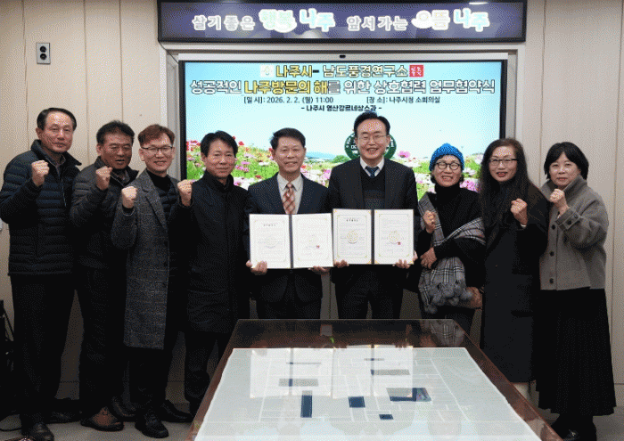 À±º´Å ³ªÁÖ½ÃÀåÀº ¡°À̹ø Çù¾àÀº ´Ü¼øÇÑ Çà»ç ±â·ÏÀ» ³Ñ¾î ¿µ»ê° Á¤¿ø°ú ²É´ÜÁö, ½Ã¹ÎÀÇ ÀÏ»óÀ» ³ªÁÖÀÇ ¹®È ÀÚ»êÀ¸·Î ÃàÀûÇÏ´Â Çù·Â¡±À̶ó¸ç ¡°³²µµÇ³°æ¿¬±¸¼Ò¿Í ÇÔ²² ½Ã¹Î°ú ¹æ¹®°´ÀÌ ´Ù½Ã ã°í ½ÍÀº dz°æÀ» ¸¸µé¾î ¡®³ªÁֹ湮ÀÇ ÇØ¡¯ÀÇ Àǹ̸¦ ´õ¿í È®ÀåÇØ ³ª°¡°Ú´Ù¡±°í ¹àÇû´Ù.