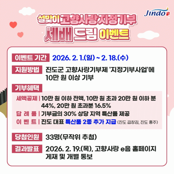 À̹ø À̺¥Æ®´Â ¼³ ¸íÀýÀÇ Àǹ̸¦ ´ã¾Æ, Áøµµ±º °íÇâ»ç¶û±âºÎÁ¦ ÁöÁ¤±âºÎ»ç¾÷¿¡ 10¸¸ ¿ø ÀÌ»óÀ» ±âºÎÇÑ ±âºÎÀÚ¸¦ ´ë»óÀ¸·Î, Ãß÷À» ÅëÇØ Ư»êǰ 2Á¾(Áøµµ È«ÁÖ, Áøµµ °öâ±è)À» Ãß°¡ Á¦°øÇØ, ÃÑ 3Á¾ ÀÌ»óÀÇ Áøµµ Ư»êǰÀ» Á¦°øÇÏ´Â ¡®¼¼¹è µå¸²¡¯ Çà»ç´Ù.