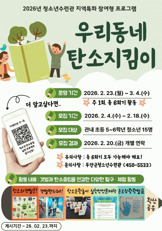 ¸ðÁý ´ë»óÀº ¹«¾È±º °ü³» ÃʵîÇб³ 5~6Çгâ û¼Ò³âÀ̸ç, ½ÅûÀº 2¿ù 18ÀϱîÁö ¼±Âø¼øÀ¸·Î Á¢¼öÇÑ´Ù.