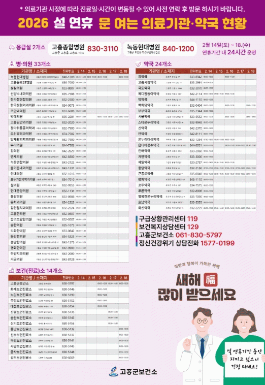 ÇÑÆí, ¼³ ¿¬ÈÞ ±â°£ Áø·á°¡ °¡´ÉÇÑ ÀÇ·á±â°ü°ú ¾à±¹ Á¤º¸´Â °íÈﱺº¸°Ç¼Ò ´©¸®ÁýÀ̳ª ÀÀ±ÞÀÇ·áÆ÷Åп¡¼ È®ÀÎÇÒ ¼ö ÀÖÀ¸¸ç, °íÈﱺ º¸°Ç¼Ò·Î ¹®ÀÇÇϸé ÀÚ¼¼È÷ ¾È³»¹ÞÀ» ¼ö ÀÖ´Ù.