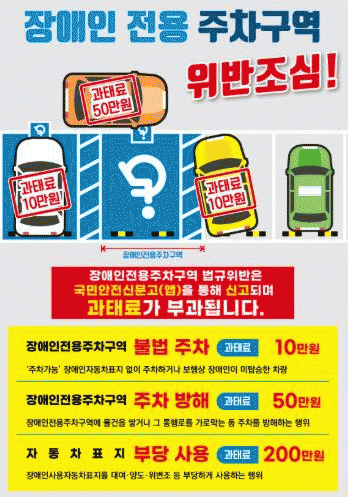 À§¹Ý À¯Çüº° °úÅÂ·á ±âÁØÀº ¡ãºÒ¹ýÁÖÂ÷ 10¸¸ ¿ø(Àå¾ÖÀÎÁÖÂ÷Ç¥Áö ¹Ì¹ß±Þ Â÷·® ÁÖÂ÷, Àü¿ë±¸¿ª ħ¹ü, Ç¥Áö ¹ÌºÎÂø µî) ¡ãÁÖÂ÷¹æÇØ 50¸¸ ¿ø(Àü¿ëÁÖÂ÷±¸¿ª ³» ¶Ç´Â ÁÖº¯¿¡ ¹°°Ç ÀûÄ¡, 2¸é ÀÌ»ó ÀÌ¿ë ¹æÇØ ÇàÀ§) ¡ãÀå¾ÖÀÎÁÖÂ÷Ç¥Áö ºÎ´ç »ç¿ë 200¸¸ ¿ø(Ç¥Áö À§¡¤º¯Á¶, ´ë¿© µî)ÀÌ´Ù.