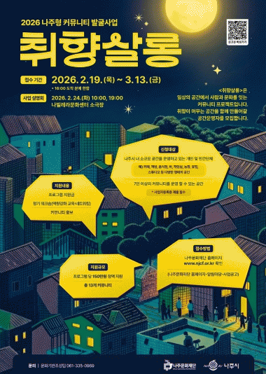 Àç´ÜÀº ½Ã¹Î ÁÖµµÀÇ »ýȰ¹®È¸¦ Ȱ¼ºÈÇϰí Áö¿ª ±â¹Ý Ä¿¹Â´ÏƼ¸¦ ¹ß±¼ ¹× À°¼ºÇϱâ À§ÇØ 2026 ³ªÁÖÇü Ä¿¹Â´ÏƼ ¹ß±¼»ç¾÷ ¡®ÃëÇâ»ì·Õ¡¯¿¡ Âü¿©ÇÒ °ø°£¿î¿µÀÚ¸¦ ¿À´Â 3¿ù 13ÀϱîÁö ¸ðÁýÇÑ´Ù°í 13ÀÏ ¹àÇû´Ù.