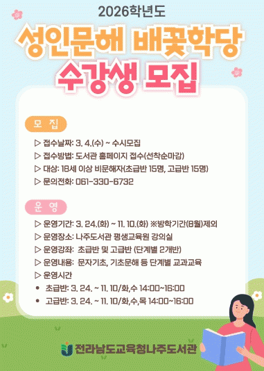 Àü¶ó³²µµ±³À°Ã»³ªÁÖµµ¼­°ü(°üÀå ±èÀǰï)Àº ¿À´Â 3¿ù 24ÀϺÎÅÍ ¼ºÀÎ ÇнÀÀÚÀÇ ±âÃÊ ¹®ÇØ ¿ª·®À» °­È­ÇØ »îÀÇ ÁúÀ» ³ôÀ̰í Áö¿ª»çȸ Âü¿©¸¦ È®´ëÇϱâ À§ÇØ ¼ºÀι®ÇØ ¹è²ÉÇдçÀ» ¿î¿µÇÑ´Ù.