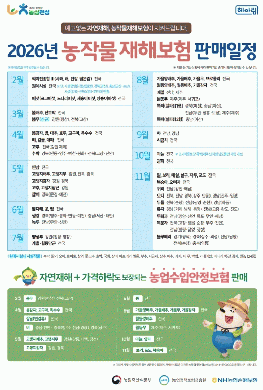 °¡ÀÔ ´ë»óÀÚ´Â º¸Çè ´ë»ó ³óÀÛ¹°À» °æÀÛÇÏ°í ³ó¾÷°æ¿µÃ¼¿¡ µî·ÏÀ» ÇÑ °³ÀÎ ¶Ç´Â ¹ýÀÎÀ¸·Î, °¡ÀÔ °¡´ÉÇÑ Ç°¸ñÀº ³óÀÛ¹° ÀçÇØº¸Çè 78°³ ǰ¸ñ°ú ³ó¾÷¼öÀÔ¾ÈÁ¤º¸Çè 20°³ ǰ¸ñÀ¸·Î º, ´ëÆÄ, °í±¸¸¶, ¿Á¼ö¼ö, Äá, ¾ç¹èÃß, °¨ÀÚ, Æ÷µµ, º¸¸® µîÀÌ ÀÖ´Ù.