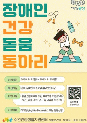 ¸ðÁý ´ë»óÀº ±¤»ê±¸ °ÅÁÖ Àå¾ÖÀÎ 5ÀÎ ÀÌ»óÀÇ ÀÚÁ¶ ¸ðÀÓ(4ÆÀ)À¸·Î, ¼±Á¤µÈ ÆÀÀº °Ç° ½ÇÅÂÁ¶»ç¸¦ ¹ÙÅÁÀ¸·Î Ȱµ¿ ºÐ¾ß¿¡ Á¦ÇÑ ¾øÀÌ µ¿¾Æ¸®¸¸ÀÇ ¸ÂÃãÇü °Ç° ÇÁ·Î±×·¥À» ÀÚÀ¯·Ó°Ô ±¸¼ºÇÒ ¼ö ÀÖ´Ù.