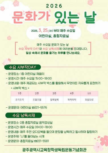 À̹ø ÇÁ·Î±×·¥Àº ½Ã¹Î°ú ¾î¸°À̵éÀÌ ´Ùä·Î¿î µ¶¼¹®È Ȱµ¿À» üÇèÇϸç ÀÏ»ó ¼Ó¿¡¼ ¹®ÈÀû ¼Ò¾çÀ» ³ÐÈú ¼ö ÀÖµµ·Ï Áö¿øÇϱâ À§ÇØ ¸¶·ÃµÆ´Ù.