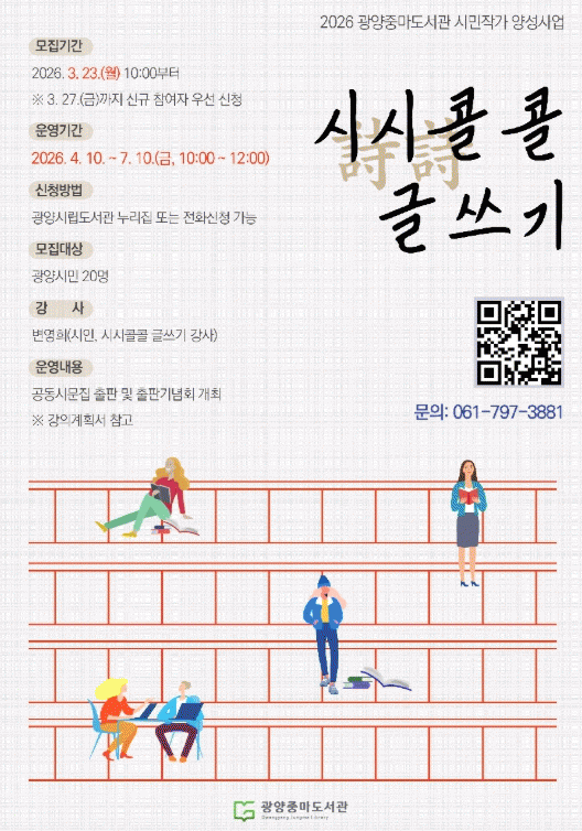 ¡®½Ã½ÃÄÝÄÝ ±Û¾²±â¡¯´Â ½Ã¸¦ ÀÐ°í ¾²´Â °úÁ¤À» ÅëÇØ ½Ã¹ÎÀÌ ¹®ÇÐÀ» Ä£¼÷ÇÏ°Ô Á¢Çϰí ÀÚ½ÅÀÇ °¨Á¤°ú »ý°¢À» ±Û·Î Ç¥ÇöÇϴ âÀÛ ÇÁ·Î±×·¥À¸·Î, ±×µ¿¾È ½Ã¹ÎµéÀÇ ²ÙÁØÇÑ °ü½ÉÀ» ¹Þ¾Æ¿Â Á߸¶µµ¼°üÀÇ ´ëÇ¥ ±Û¾²±â ÇÁ·Î±×·¥ÀÌ´Ù.