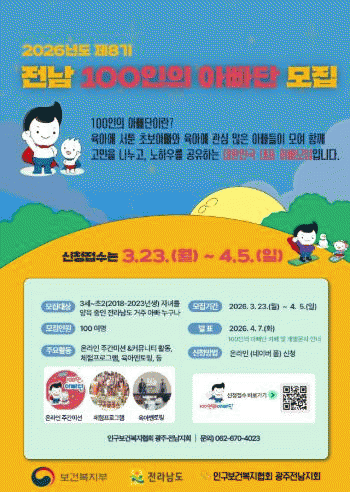 Àü¶ó³²µµ´Â ¾ÆºüÀÇ À°¾Æ Âü¿©¸¦ È®´ëÇÏ°í °¡Á· Áß½ÉÀÇ °Ç°­ÇÑ ¾çÀ°¹®È­¸¦ È®»êÇϱâ À§ÇØ 2026³â Á¦8±â Àü³² 100ÀÎÀÇ ¾Æºü´Ü Âü¿©ÀÚ¸¦ ¸ðÁýÇÑ´Ù.