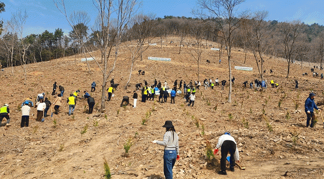 Âü¿©ÀÚµéÀº ¼Ò³ª¹«Àç¼±Ãæº´ ÇÇÇØÁöÀÎ ¹¦µµµ¿ ¼öÁ¾ÀüȯÁö 5ha¿¡ Æí¹é³ª¹« 4,000±×·ç¸¦ ½ÄÀçÇϸç ÈÑ¼ÕµÈ »ê¸²ÀÇ È¸º¹°ú °Ç°­ÇÑ ½£ Á¶¼º¿¡ ÈûÀ» º¸ÅÉ´Ù.
