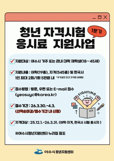Áö¿ø ´ë»ó ½ÃÇèÀº 2026³â¿¡ ÀÀ½ÃÇÑ ¾îÇÐ 19Á¾(ÅäÀÍ µî)°ú ÀÚ°Ý 545Á¾(±¹°¡±â¼úÀڰݹý ½ÃÇà±ÔÄ¢¿¡ µû¸¥ ÀڰݽÃÇè), Çѱ¹»ç ½ÃÇèÀ̸ç, Áö³ÇØ 12¿ù¿¡ ÀÀ½ÃÇÑ ½ÃÇè(¾îÇС¤ÀÚ°Ý¡¤Çѱ¹»ç)¿¡ ´ëÇØ¼µµ ¼Ò±Þ Áö¿øÀÌ °¡´ÉÇÏ´Ù.