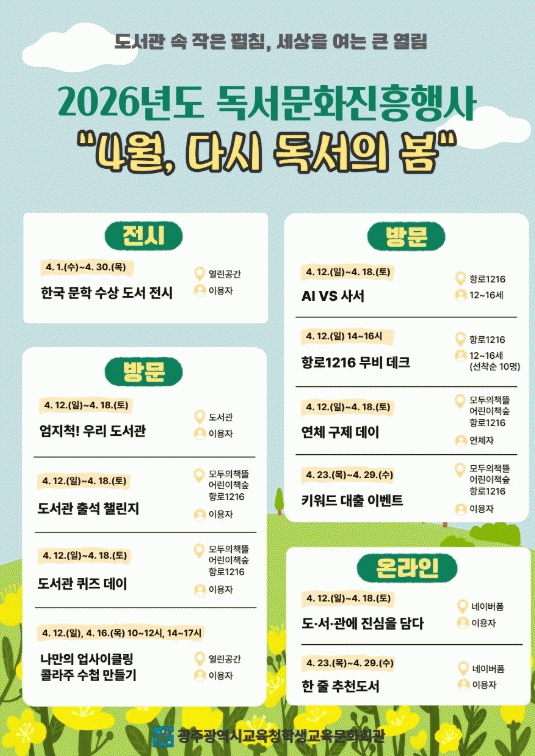 À̹ø Çà»ç´Â µµ¼°üÀÇ ³¯(4¿ù12ÀÏ)°ú µµ¼°üÁÖ°£(4¿ù12~19ÀÏ)À» ¸Â¾Æ ½Ã¹ÎµéÀÌ ´Ùä·Î¿î ÇÁ·Î±×·¥À» ÅëÇØ Ã¥¿¡ ´ëÇÑ Èï¹Ì¸¦ ³ôÀÏ ¼ö ÀÖµµ·Ï Áö¿øÇϱâ À§ÇØ ¸¶·ÃµÆ´Ù.