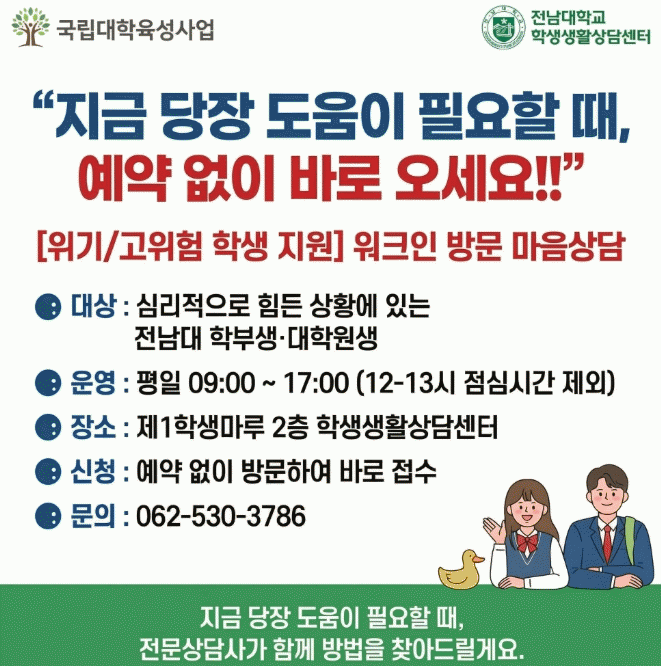 1ÀÏ Àü³²´ë¿¡ µû¸£¸é, Çлý»ýȰ»ó´ã¼¾ÅÍ´Â ½É¸®Àû À§±â¸¦ °æÇèÇÏ´Â ÇлýµéÀ» ½Å¼ÓÇÏ°Ô Áö¿øÇϱâ À§ÇØ ¡®¿öÅ©ÀÎ(Walk-in) ½É¸®»ó´ã¡¯ Á¦µµ¸¦ µµÀÔÇÏ°í º»°Ý ¿î¿µ¿¡ µé¾î°¬´Ù.