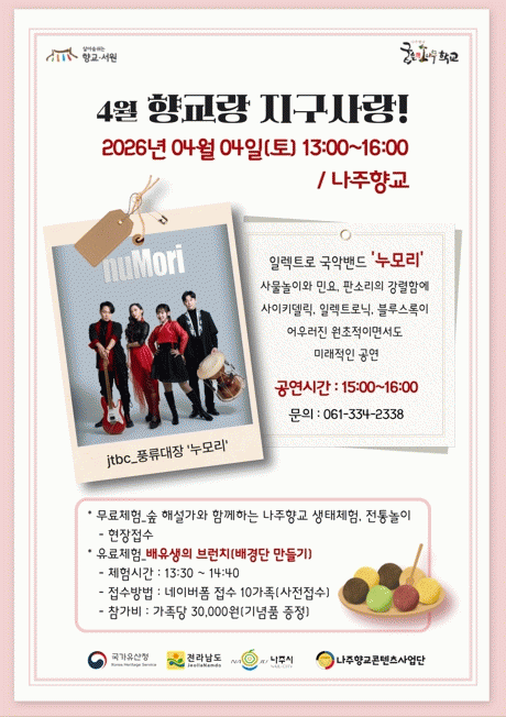 ÇÑÆí ¡®³ªÁÖÇâ±³ ±ÁÀº ¼Ò³ª¹«Çб³¡¯´Â ±¹°¡À¯»êû°ú Àü¶ó³²µµ, ³ªÁֽð¡ ÁÖÃÖÇÏ°í ³ªÁÖÇâ±³ÄÜÅÙÃ÷»ç¾÷´ÜÀÌ À§Å¹¹Þ¾Æ ¿î¿µÇÏ´Â Áö¿ª ¹®ÈÀ¯»ê Ȱ¿ë»ç¾÷À¸·Î 4¿ùºÎÅÍ 11¿ù±îÁö üÇè°ú °ø¿¬, ¼÷¹ÚÇü ÇÁ·Î±×·¥ µî ´Ù¾çÇÑ ÄÜÅÙÃ÷¸¦ ¼±º¸ÀÏ °èȹÀÌ´Ù.