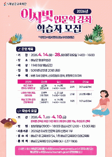 ÇØ³²±º±³À°Àç´ÜÀº¡®Çس² ÀÌ»çºû Àι®ÇÐ °Á¡¯¸¦ ÅëÇØ ±º¹ÎÀÇ Àι®ÇÐÀû ÀÌÇØ¿Í °Ç° ÁõÁø, Áö¿ª ¹®È Ȱ¼ºÈ¸¦ µµ¸ðÇÏ°í ¾ÕÀ¸·Îµµ Æò»ý±³À° ÇÁ·Î±×·¥À» È®´ëÇØ ±º¹Î ÇнÀ±Ç º¸Àå°ú »îÀÇ Áú Çâ»ó¿¡ ±â¿©ÇÒ °èȹÀÌ´Ù.